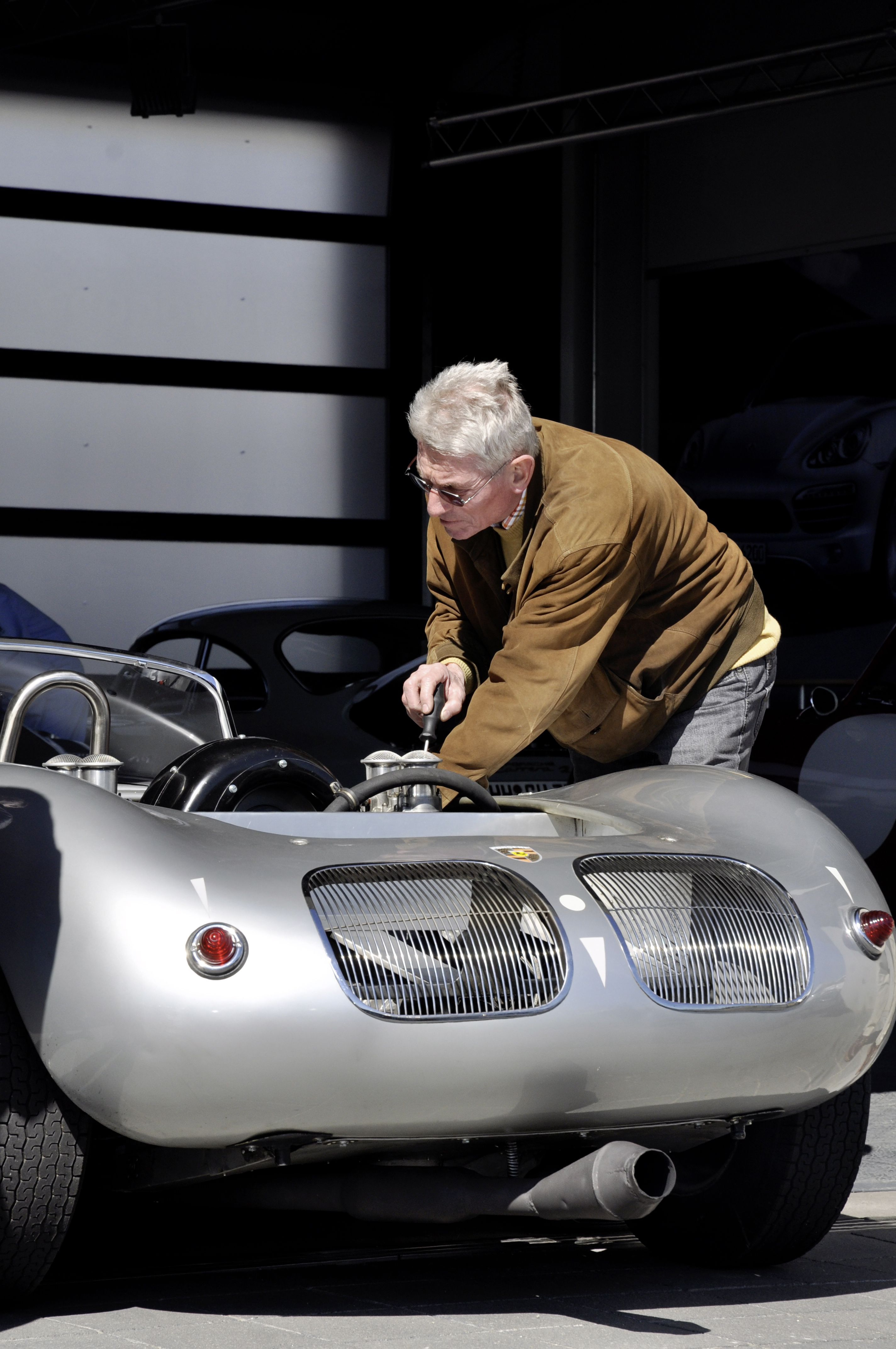 In der Box steht ein roter Porsche 356 Carrera. Wunderschön, aber nicht mehr der Jüngste. Beim ersten Anspringen verschluckt sich der Motor und bleibt dann still. Nur mit einem Schraubendreher ausgerüstet beugt sich ein hagerer Mann im grauen Hausmeisterkittel über den Motor und schraubt am Vergaser. Der Anlasser dreht noch eine Runde, dann schüttelt und rüttelt sich der legendäre Königswellenmotor, bevor er mit atemberaubendem Lärm rund läuft.